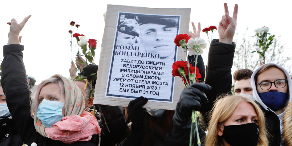 IMG Bild: Menschen mit einem Bild Roman Bondarenko während einer Gedenkveranstaltung in Minsk
