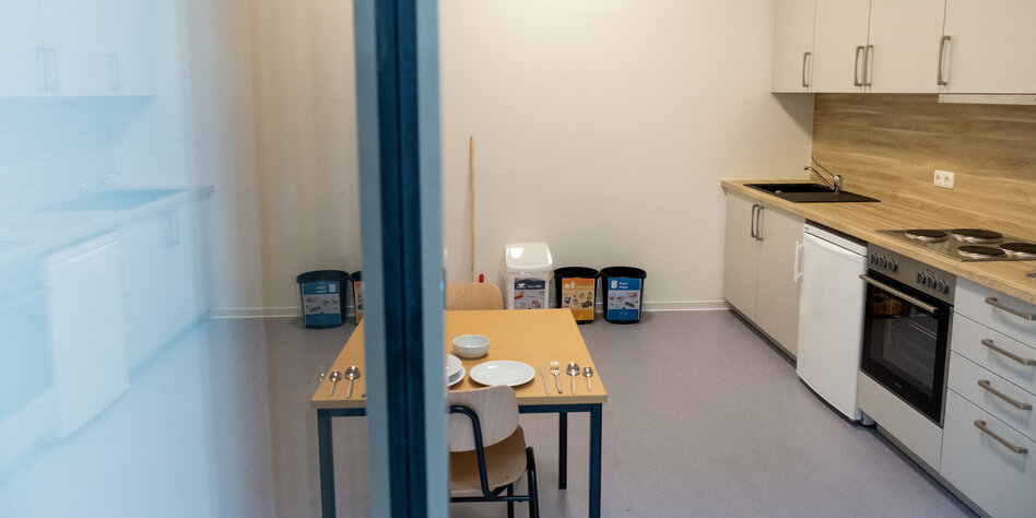 IMG Bild: Eine Küche in der neuen Flüchtlingsunterkunft in Berlin-Marzahn mit abgeschlossenen Wohneinheiten
