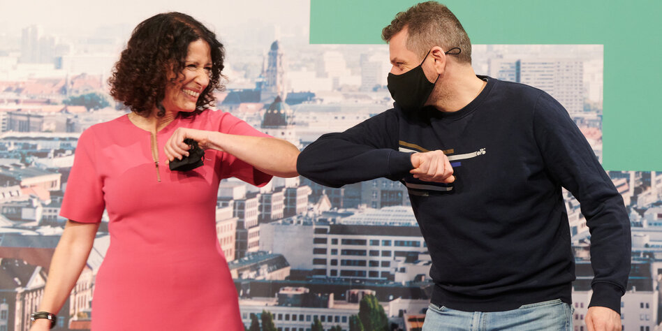 IMG Bild: Der Chef und die Spitzenkandidatin: Bettina Jarasch und Werner Graf beim Ellenbogencheck