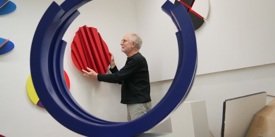 IMG Bild: Michael M. Heyers bei der Installation seiner Werke