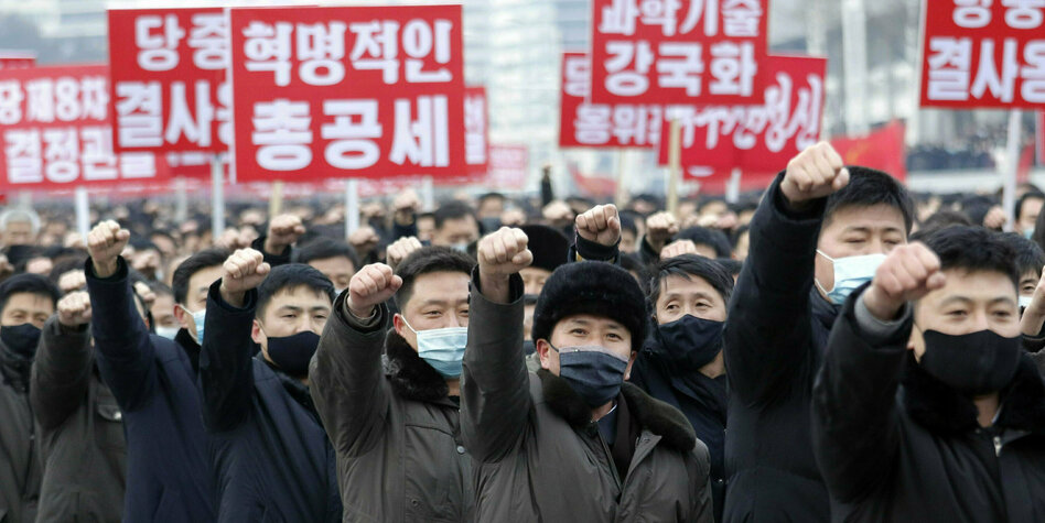 IMG Bild: Masken, obwohl Nordkorea angeblich coronafrei ist: Nordkoreaner bei einer Parade im Januar
