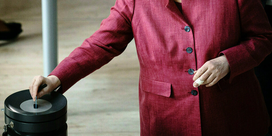 IMG Bild: Angela Merkel bei der Stimmabgabe zur „Bundesnotbremse“