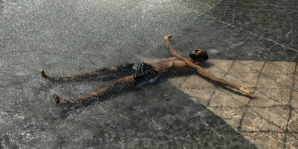 IMG Bild: Wenigstens kurz etwas Kühle: Ein Mann liegt im Pool des Rathauses der kanadischen Stadt Edmonton