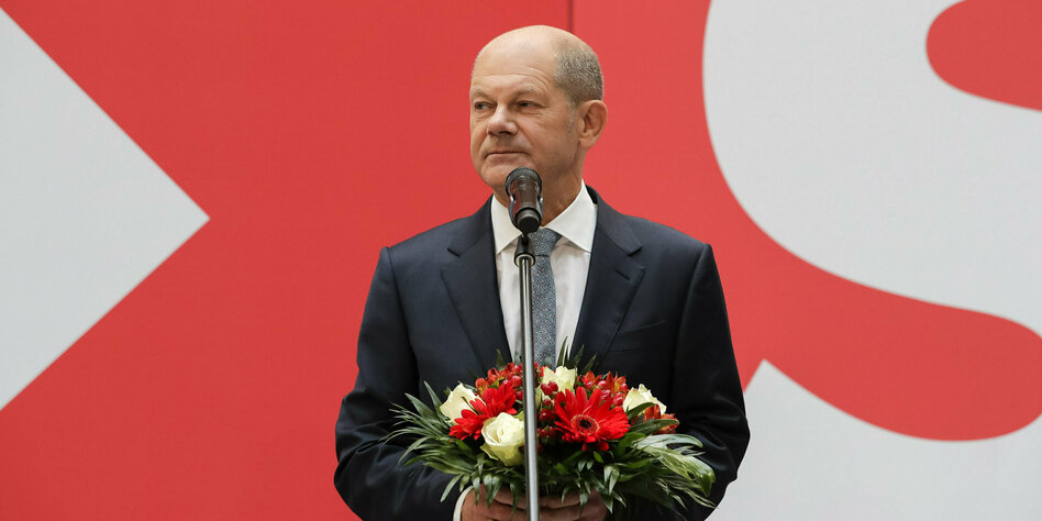 IMG Bild: Der Scholzomat: Olaf Scholz feiert am 27. September mit Blumenstrauß den Wahlsieg