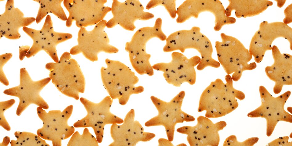 Fischbiskotten knabbern, Bisquitkeksen in Fischform. Das soll Glück