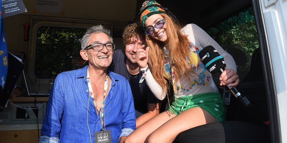 IMG Bild: Cosmo-Musikchef Francis Gay mit Reporter Keno Mescher und Rapperin Hayiti (v. l. n. r.)