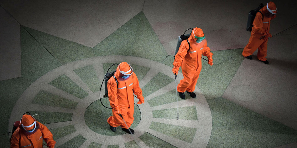 IMG Bild: Kampf gegen „ein sich explosionsartig verbreitendes Fieber“: Desinfektion im Bahnhof von Pjöngjang