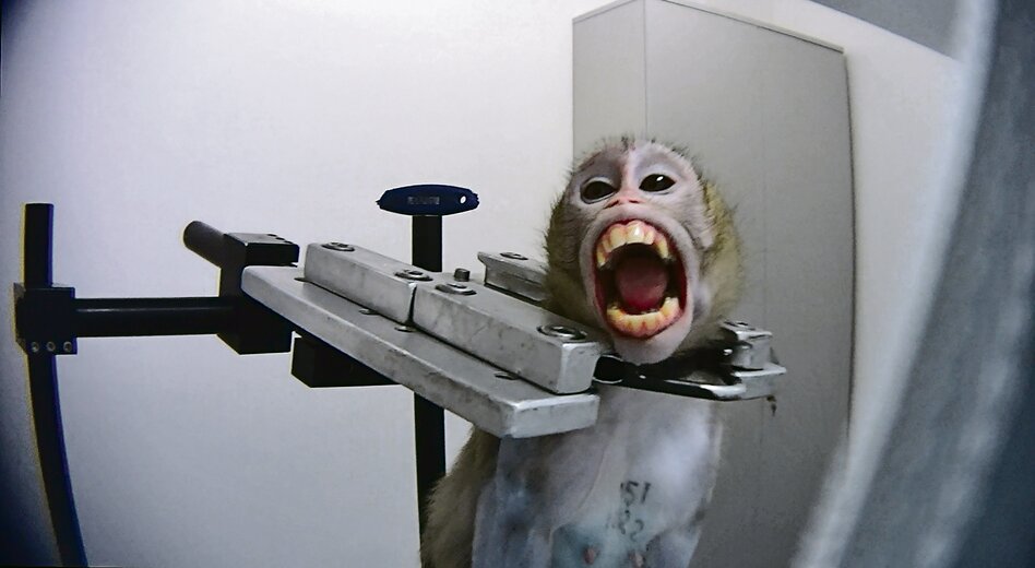 IMG Bild: Panische Angst: Ein fixierter Affe im Tierversuchslabor LPT