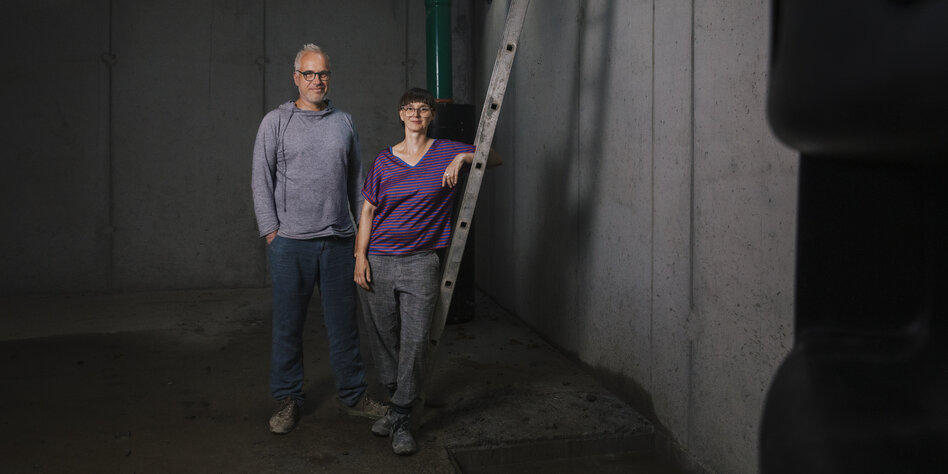 IMG Bild: Sven Hänichen und seine Kollegin Han Van Acoleyen im Inneren der Regenwasserzisterne