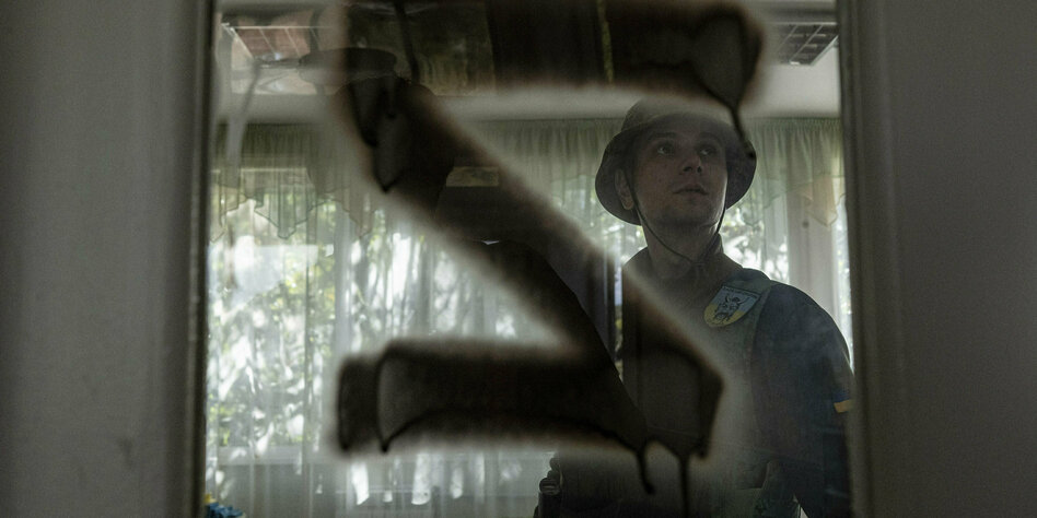 IMG Bild: Ein ukrainischer Soldat sichtet ein „Z“ in einem Kindergarten im zurückeroberten Gebiet Kapitoliwka