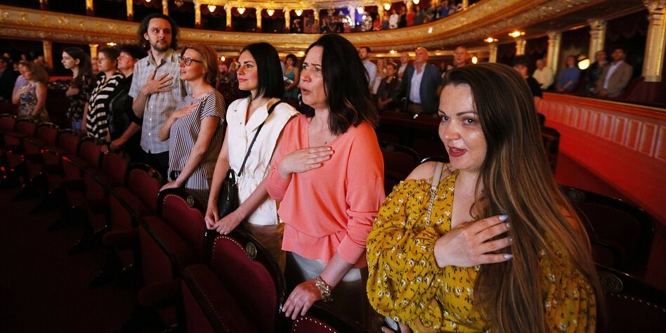 IMG Bild: Odessa, 17. Juni: Konzertbesucher:innen singen die ukrainische Nationalhymne