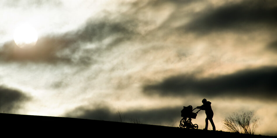 IMG Bild: Gegenwind, und viel bergauf: Frau mit Kinderwagen