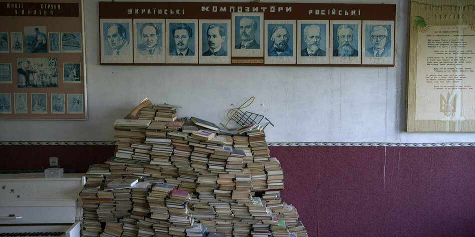 IMG Bild: Schulbücher in Chernihiv: Welche davon darf man laut Regierungsverordnung wohl noch behalten?