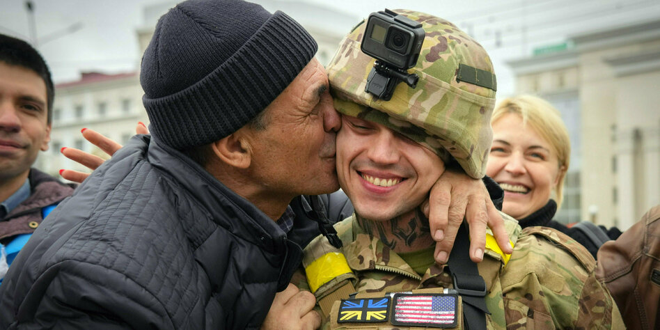 IMG Bild: Bewohner von Cherson feiert ukrainischen Soldaten nach der Befreiung der Stadt im November