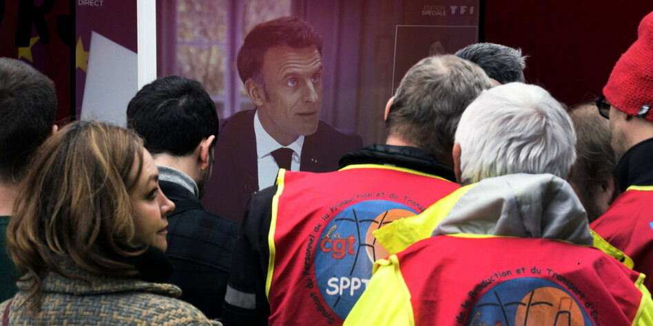 IMG Bild: Streikende verfolgen den französischen Präsidenten Macron während seiner Fernsehansprache