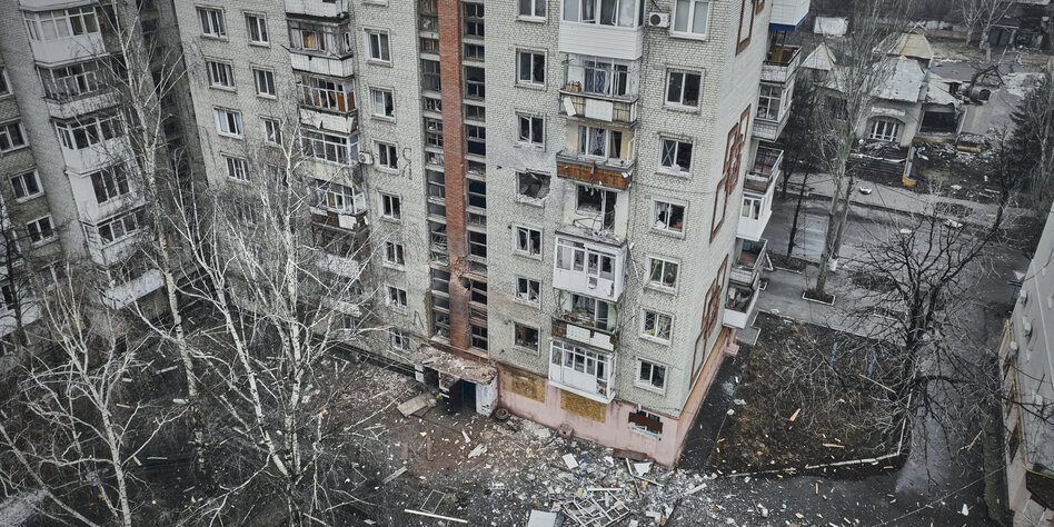 IMG Bild: Ein beschädigtes Wohngebäude in Bachmut Ende März 2023