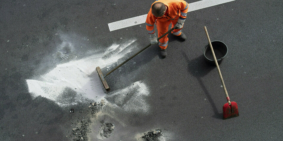 IMG Bild: Demokratie ist anstrengend: Ein Mitarbeiter der Autobahn-Straßenmeisterei nach einer Blockade-Aktion