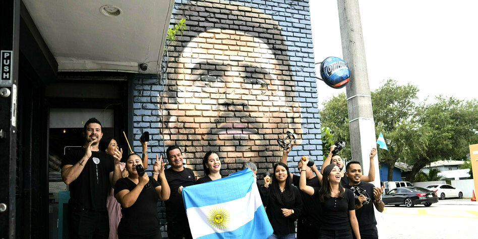IMG Bild: Messi-Gemälde gibt es bereits in Miami. Fans posieren mit Fahne vor einem Restaurant