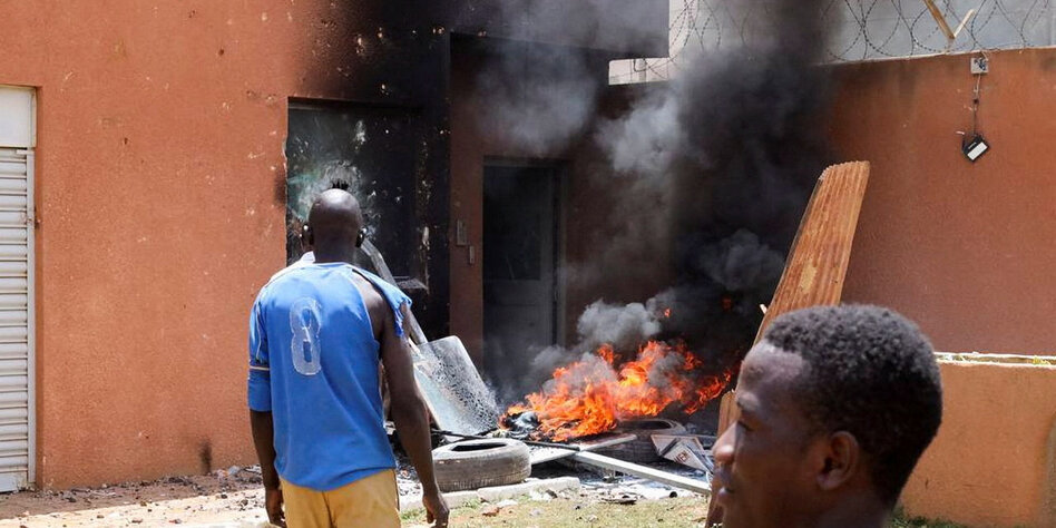 IMG Bild: Die Spannung steigt: Putschbefürworter legen Feuer am Eingang von Frankreichs Botschaft in Niamey
