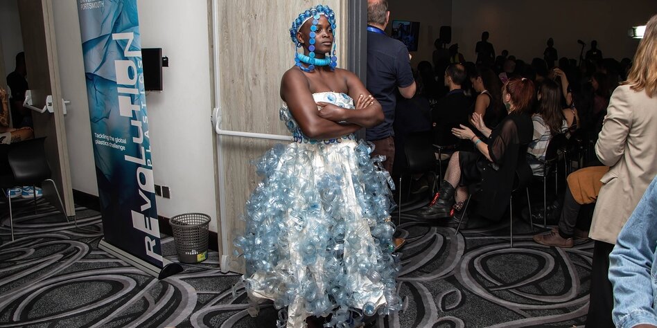 IMG Bild: Kein blaues Wunder: Recyceltes Kleid als Symbol des Protests. Leider wirkte es nicht