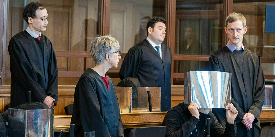 IMG Bild: Die Angeklagten und ihre Anwält:innen im Gerichtssaal des Kriminalgerichts Moabit am Montag