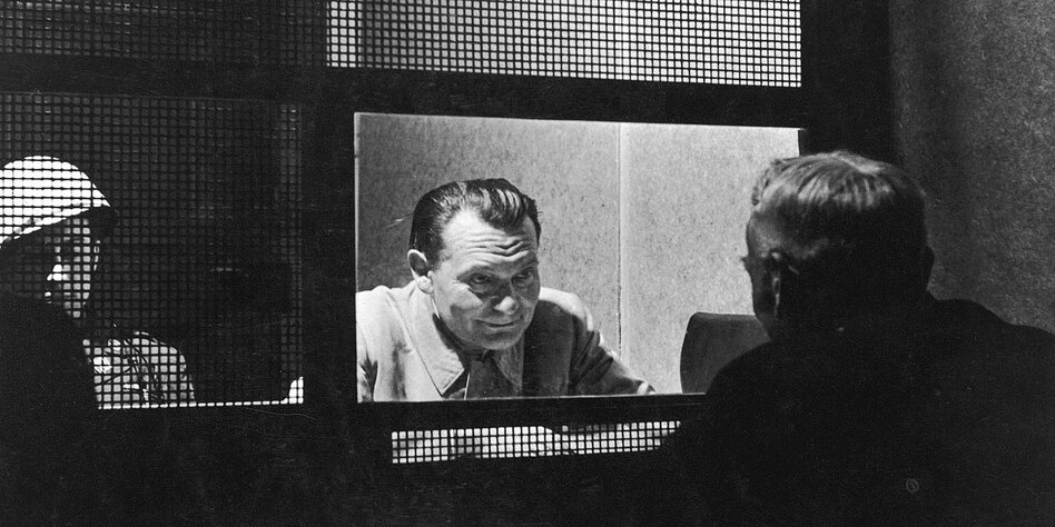 IMG Bild: Hermann Göring mit seinem Anwalt Dr. Otto Stahmer während der Nürnberger Kriegsverbrecherprozesse 1946