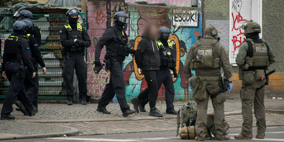 mehrstündigen Durchsuchungen in dem Gelände im Stadtteil Friedrichshain].