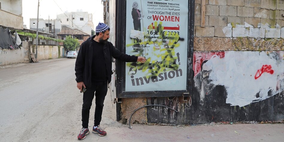 IMG Bild: Ahmed Tobasi vom Freedom Theatre in Dschenin im Januar: Israelische Soldaten hätten den Davidstern aufgesprüht, heißt es