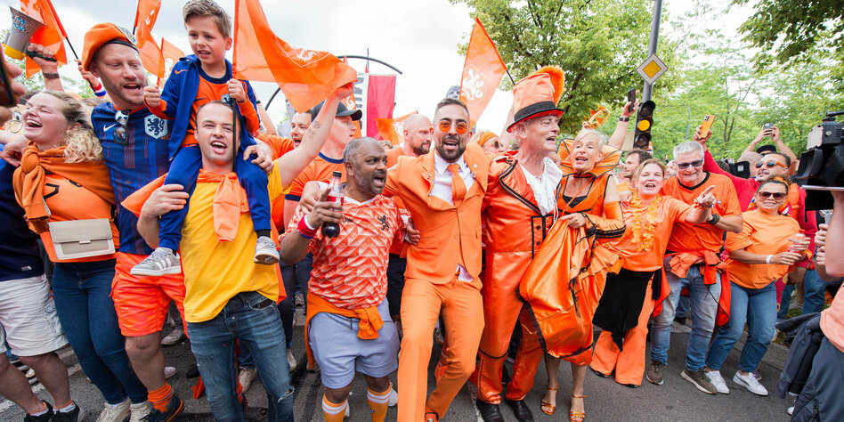 Oranje-Fans seit Beginn der EM gemeinsam auf ihrem Weg zum Stadion],