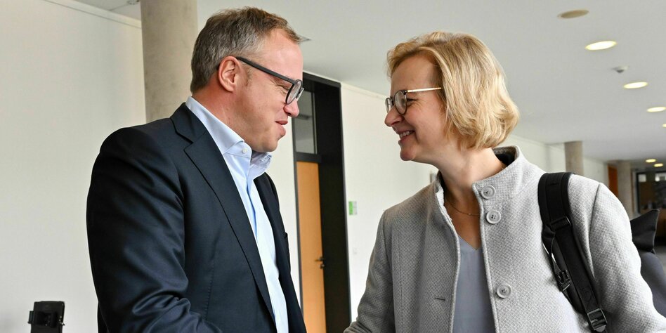 IMG Bild: Mario Voigt (CDU) und Katja Wolf (BSW) begrüßen sich schon mal überaus freundlich