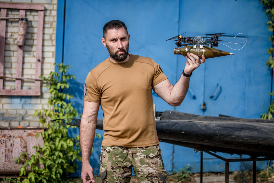 IMG Bild: Der leitende Sprengstofftechniker der Region Sumy, Ihor Tschernjak, mit einer russischen Drohne