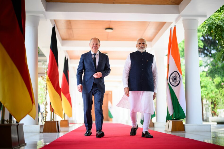 IMG Bild: Wirtschaftlich und militärisch soll die Kooperation enger werden: Kanzler Scholz beim indischen Premier Narendra Modi