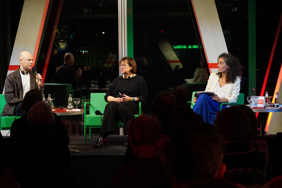 IMG Bild: Iwan Kolpakow, Meduza-Chefredakteur, und Galina Timtschenko, CEO Meduza, im Gespräch mit der Leiterin der taz Panter Stiftung in der taz