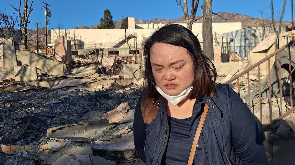 IMG Bild: In Schutt und Asche: Linda Zeng steht vor den Trümmern ihres Hauses