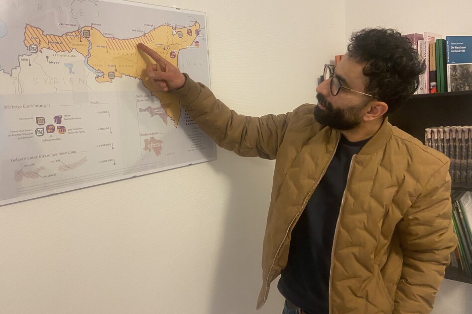 IMG Bild: Bzad Dher von der Vertretung der Demokratischen Selbstverwaltung von Nord- und Ostsyrien in Berlin zeigt auf eine Karte von Rojava