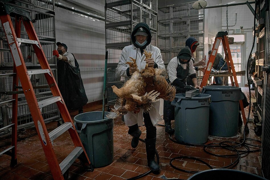 IMG Bild: Vogelgrippe in den USA: Angestellte säubern Teile der Käfige und bringen die letzten Hühner zur Schlachtung