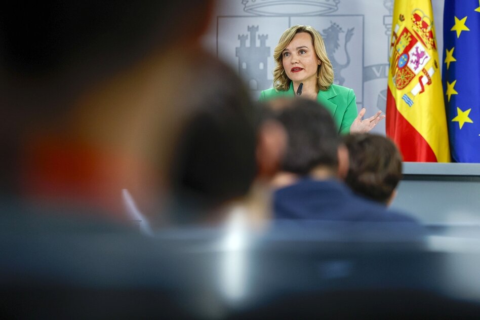 IMG Bild: Die spanische Regierungssprecherin Pilar Alegria in einer Pressekonferenz in Madrid am 20. Mai
