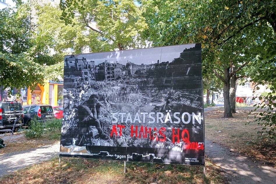 IMG Bild: Pro-palästinensische und pro-israelische Stimmen streiten auf einem Plakat in Berlin
