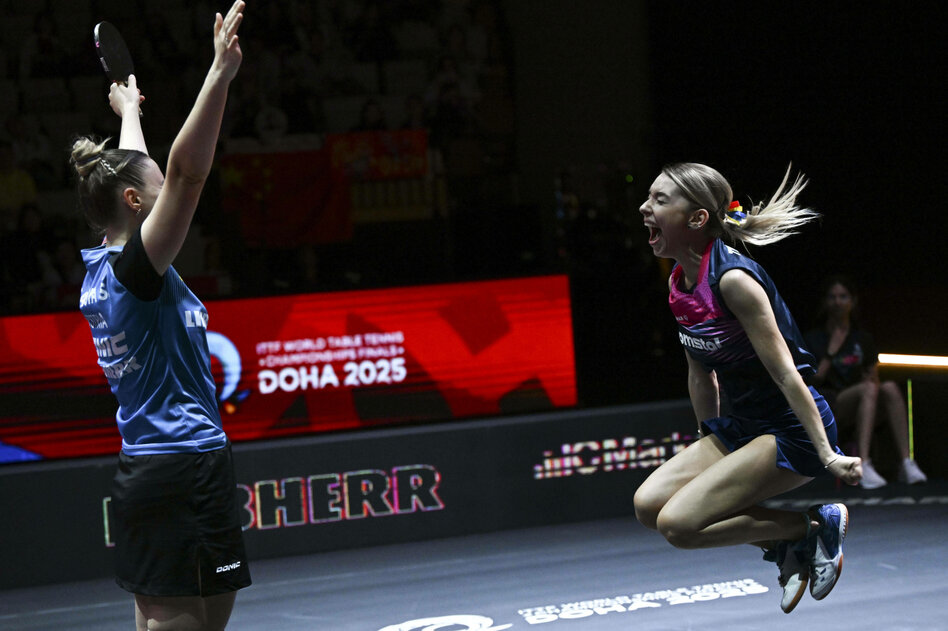 IMG Bild: Noch Tischtennishalle oder schon Dancefloor? Sofia Polcanova und Bernadette Szocs feiern den Sieg im WM-Halbfinale