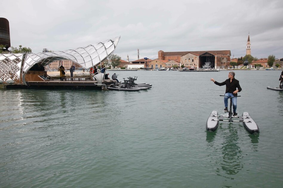 IMG Bild: Sport ist da, wo man ihn erblickt: Carlo Ratti, Direktor der Architektur-Biennale 2025 in Venedig, auf einem Wasserfahrrad