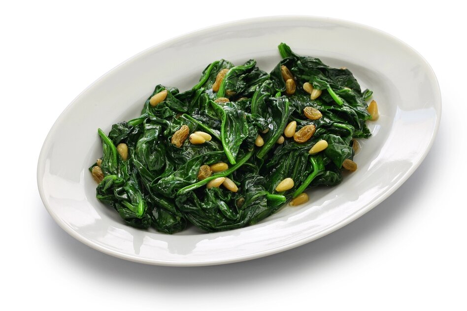 IMG Bild: Beispielhaft für die katalanischen Küche: süß und salzig – Espinacas a la catalana, Spinat mit Rosinen und Pinienkernen