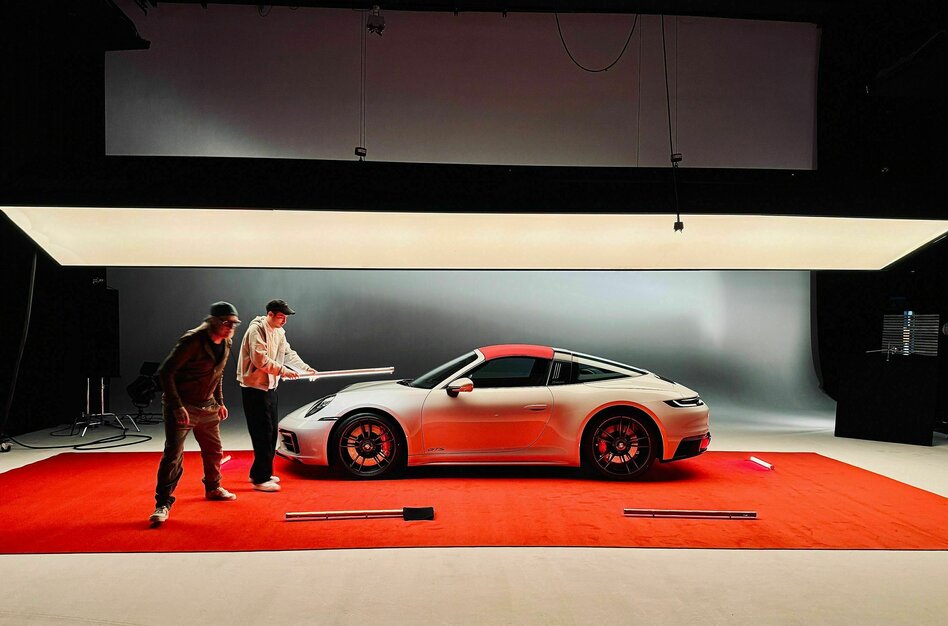 IMG Bild: Im Studio von Fotograf René Staud wird ein aktuelles Porsche-Modell für ein neues Fotobuch ausgeleuchtet