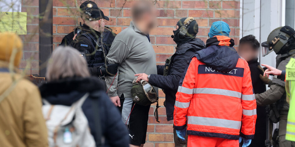 getragen wird, vorbei an weiteren Polizist:innen und Rettungskräften.