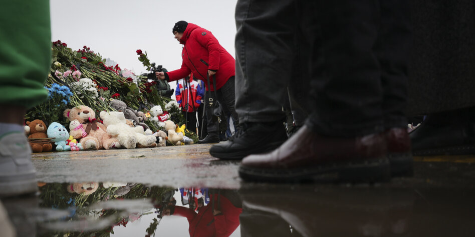IMG Bild: Russland gedenkt an diesem Sonntag der Opfer des Anschlags in Moskau. Menschen legen Blumen und Spielzeug am Zaun neben der Crocus City Hall nieder