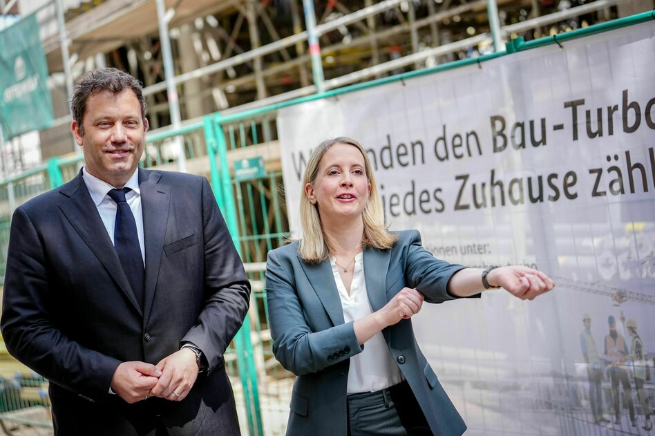 IMG Bild: Verena Hubertz mit Lars Klingbeil geben auf einer Berliner Bauerstelle eine Pressekonferenz zum „Bau-Turbo“ im Juni 2025