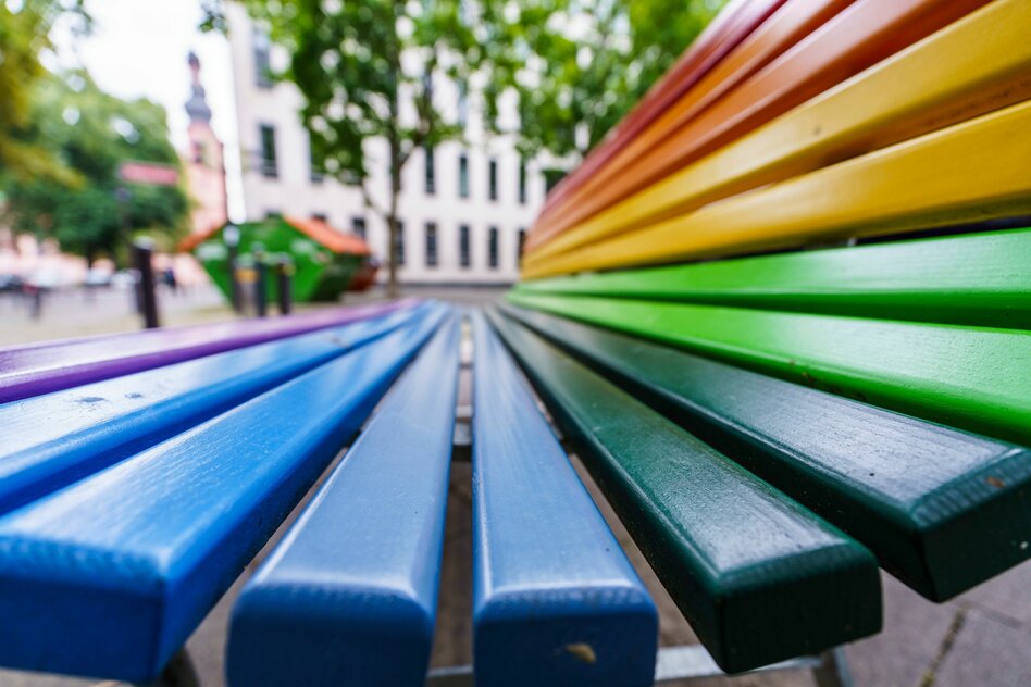 IMG Bild: Eine Bank im Regierungsviertel in Regenbogenfarben