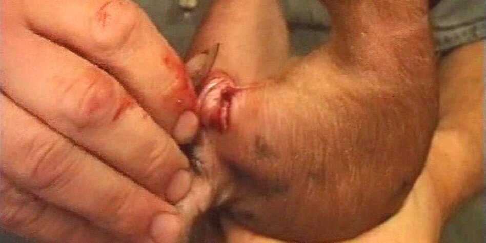 IMG Bild: Das tut weh: Einem Ferkel werden ohne Betäubung die Hoden herausgeschnitten