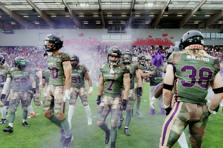 Die Football-Mannschaft Frankfurt Galaxy läuft ein, umgeben von