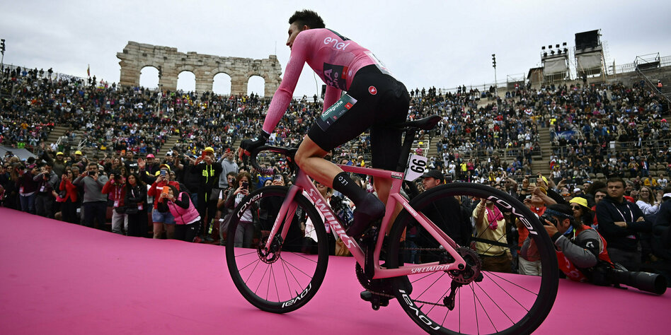 IMG Bild: Rosige Aussichten: Jai Hindley trägt in der Arena von Verona das Siegershirt