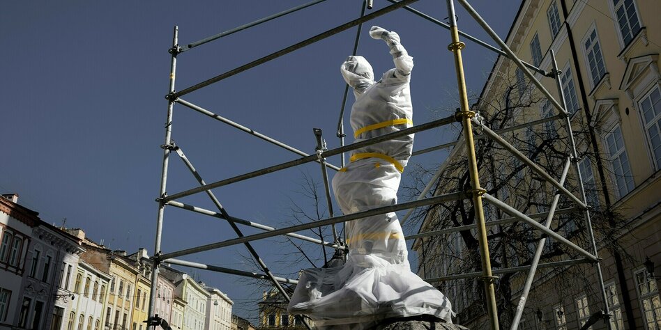 IMG Bild: Mit Plastikfolien sollen Statuen, wie hier in Lviv, vor der Zerstörung geschützt werden